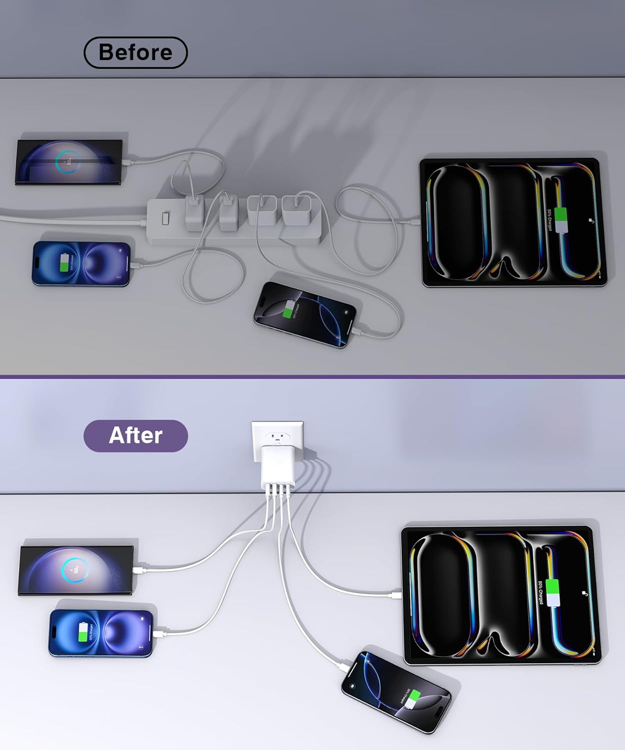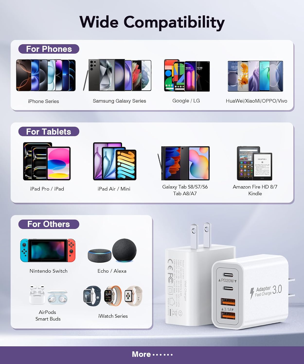 Multiport Charging Plug: The charger brick has Dual USB-C ports and Dual USB-A ports. Allow users to charge phone, tablet and headphones simultaneously to minimize waiting time. It’s also a great space saver instead of taking up 4 wall outlet ports. The best replacement for your original usb charger