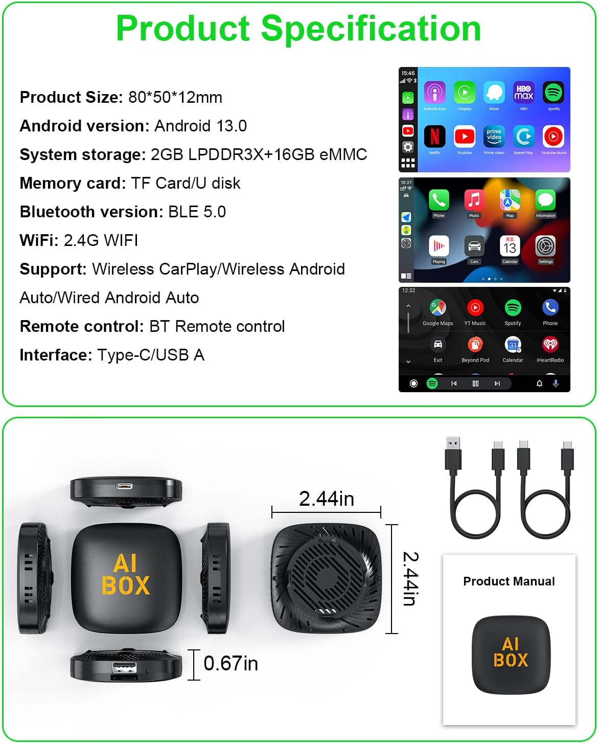 【Wide Compatibility】This Wireless Carplay and Android Auto adapter comes with USB-C to USB-A/USB-C cable, is suitable for more than 800 car models after 2016 with factory wired Carplay. NOTE: Not compatible with BMW, Tesla. Before making a purchase, please refer to the provided picture to confirm if your vehicle is supported. In case your model is not listed, feel free to inquire about its compatibility. And it support mobile phones with Apple version 10.0 and above and Android 11.0 and above.