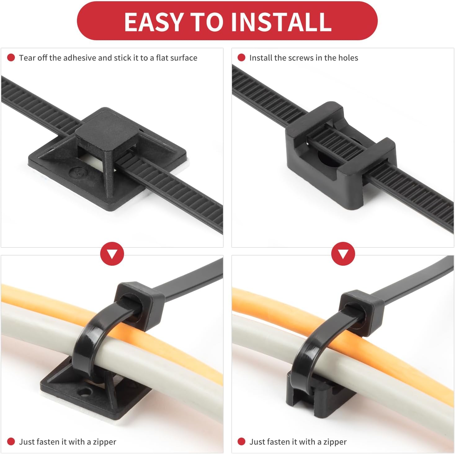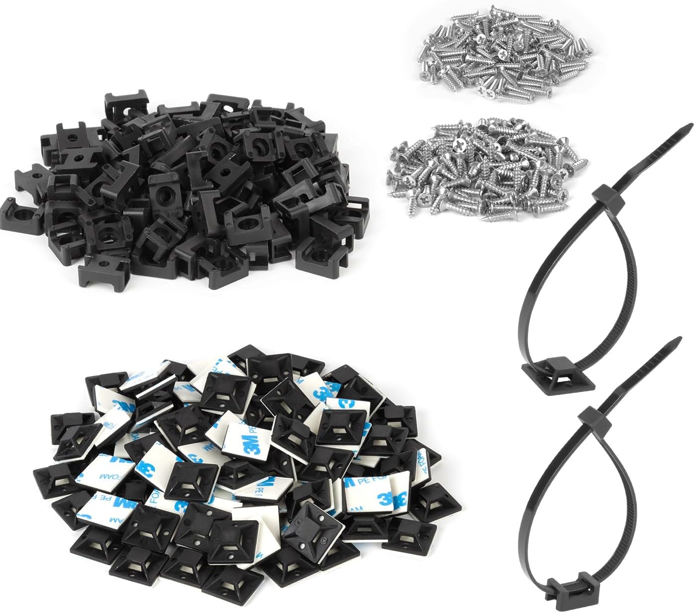 【Comprehensive Installation Kit】Includes 200PCS 8 inch black zip ties, 100pcs 3M adhesive mounts with 100 pcs 3/4” zip ties screw-down saddles and 300 pcs screws, providing a versatile installation solution suitable for securing various devices and cables.