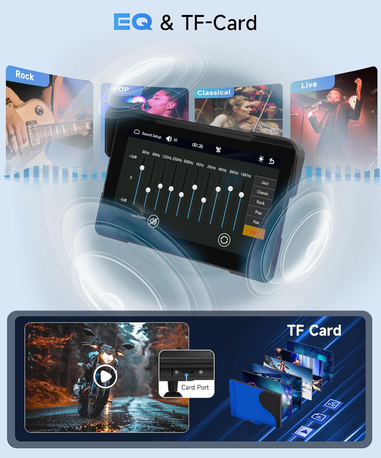【EQ Effect】: The Motorcycle CarPlay’s also includes a built-in EQ function, offering a variety of music styles and sound effects.