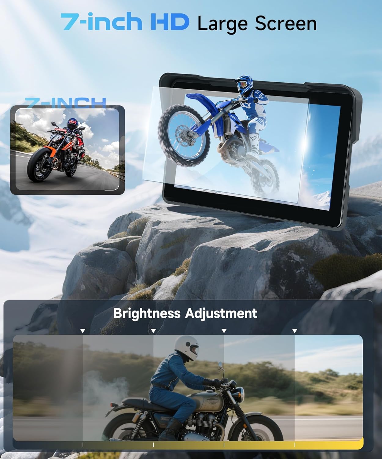 【HD 7-inch IPS Touchscreen & IP67 Waterproof】The motorcycle carplay screen’s comes with a 7-inch HD IPS touchscreen, which offers higher color intensity, a more intuitive display, and a more responsive touch than the regular 5-inch carplay motorcycle.With motorcycle carplay screen for car’s IP67 rating and anti-theft removable bracket, the carplay can cope perfectly with rain or sunshine