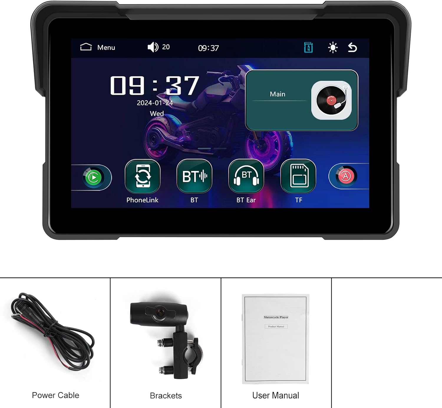 Screen: 1024*600 Voltage: 12V Installation method: Vertical stand Intelligent interconnection: support IOS CarPlay/Android Auto Waterproof level: IP67 Reset: Support Firmware version: Support CarPlay:wireless Android Auto:wireless airplay:wireless Android cast:wireless SD card: Supports local audio playback Wallpaper Replacement: Supported EQ: Support Touch calibration: Support Display Settings: Supported Time setting: Supported BT music:Supported Bluetooth headset:Supported Time saving: Built-in capacitor