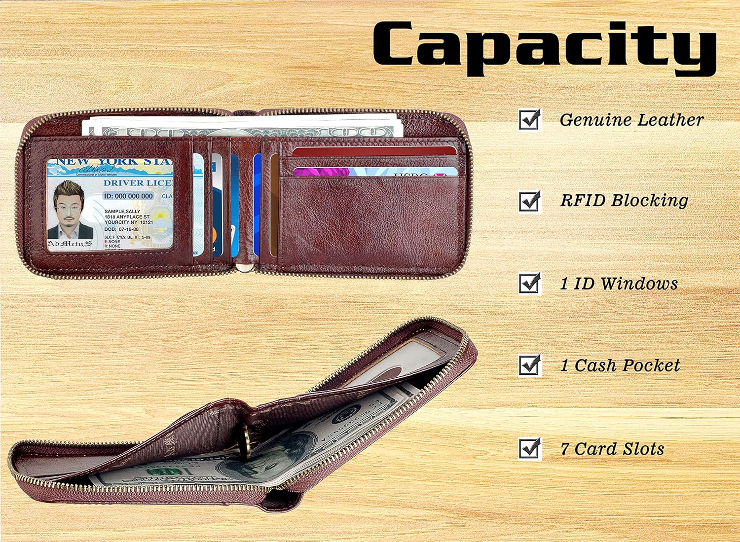 The zipper closure prevent the dust, keep your cards from losing, keep cash/coin/ID cards/credit cards/SD cards/receipts organized well.