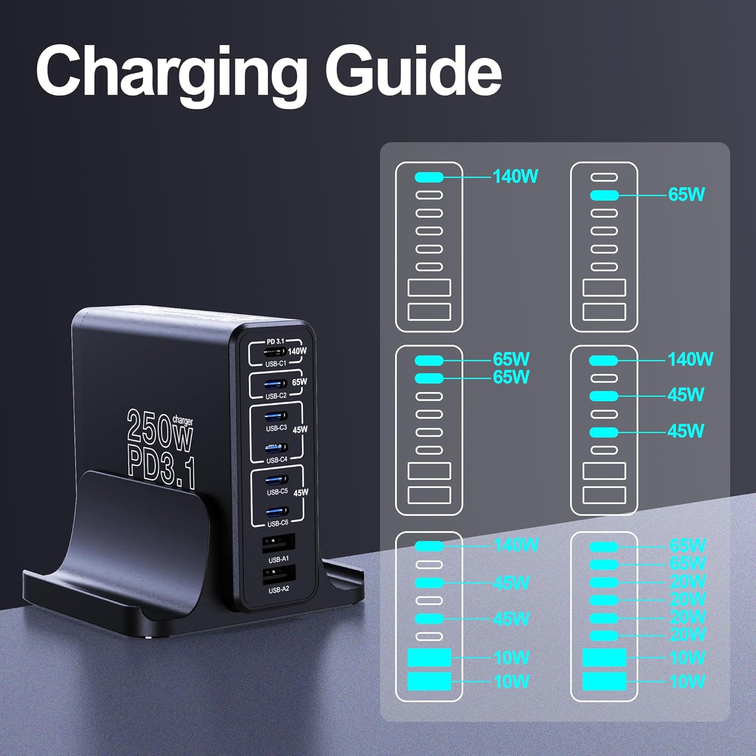 Aftertop 250W USB C Charger, 8-Ports PD3.1 140W Fast Charging Station, Compact Laptop GaN Charger for MacBook, iPad, iPhone 16 15 Pro Max, Galaxy S24/S23 Ultra, Pixel and More