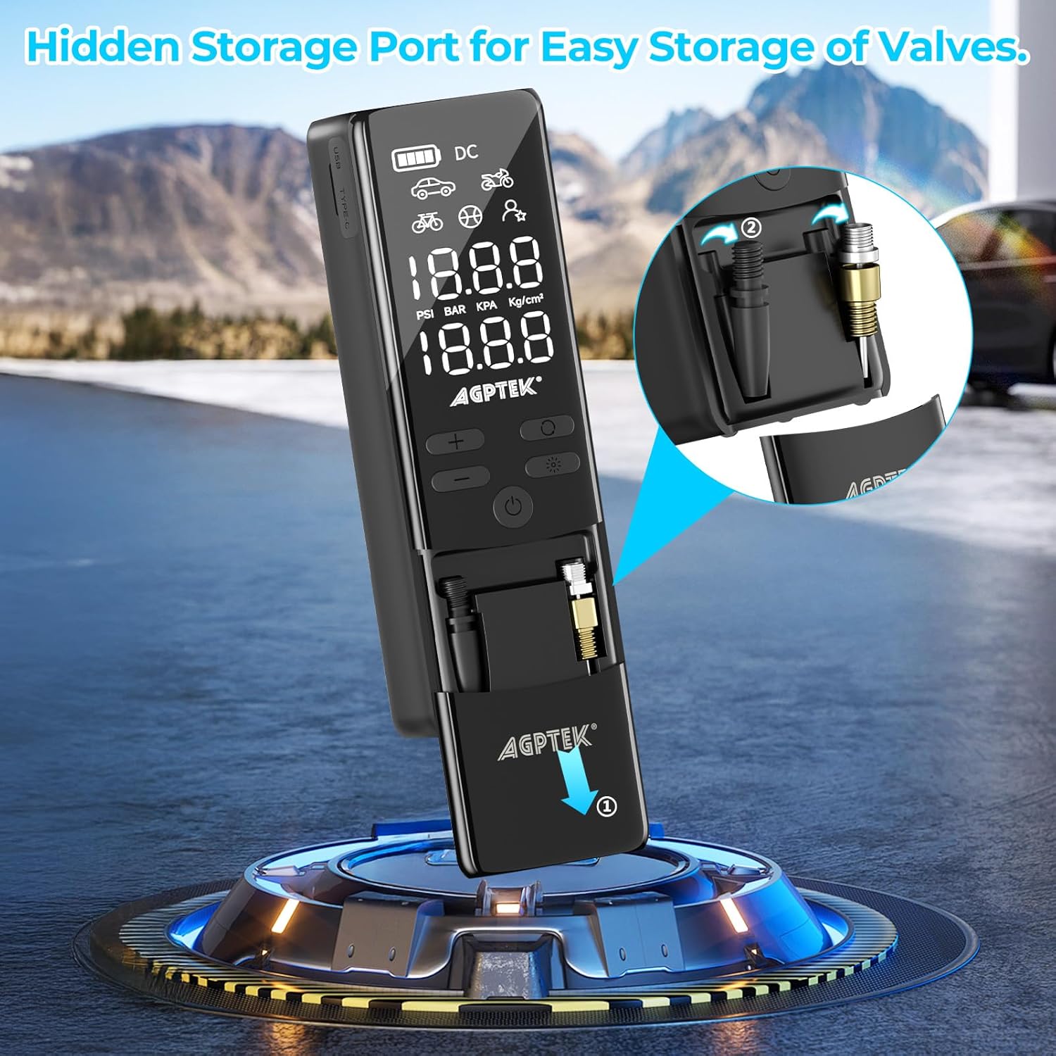 Storage Compartment: Featuring a convenient storage compartment, this pump allows you to store three various inflatable parts by opening the lid on the lower half of the device to prevent small parts from getting lost. The cordless tire inflator boasts a compact design that is both portable and space-saving. Easy to store in cars, bike racks, or backpacks, it is ideal for on-the-go inflation needs during travel or at home. This cordless tire inflator comes with multiple accessories and is an essential product for drivers, cyclists, and adventure enthusiasts.