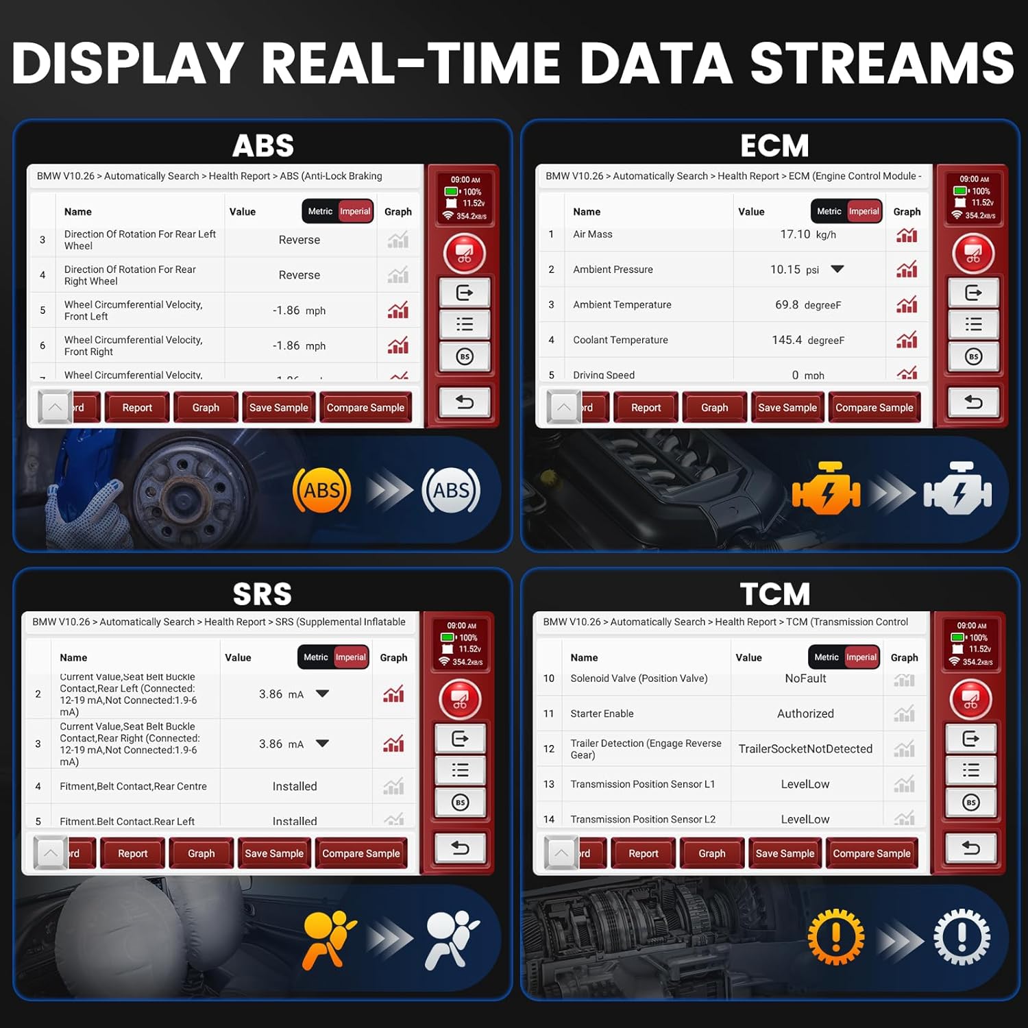 [4-System Diagnostics] – Offers a comprehensive scan of your vehicle’s four key systems: Engine, Transmission, ABS, and Airbag (SRS). With enhanced OBD-II technology and live data analysis, it helps detect common issues such as misfires, rough gear shifts, ABS sensor faults, or airbag warning lights. Provides rapid problem identification for faster repairs. NOTE: Airbag crash data cannot be erased, even after replacing the airbag, it stays permanently in the control unit per safety regulations.