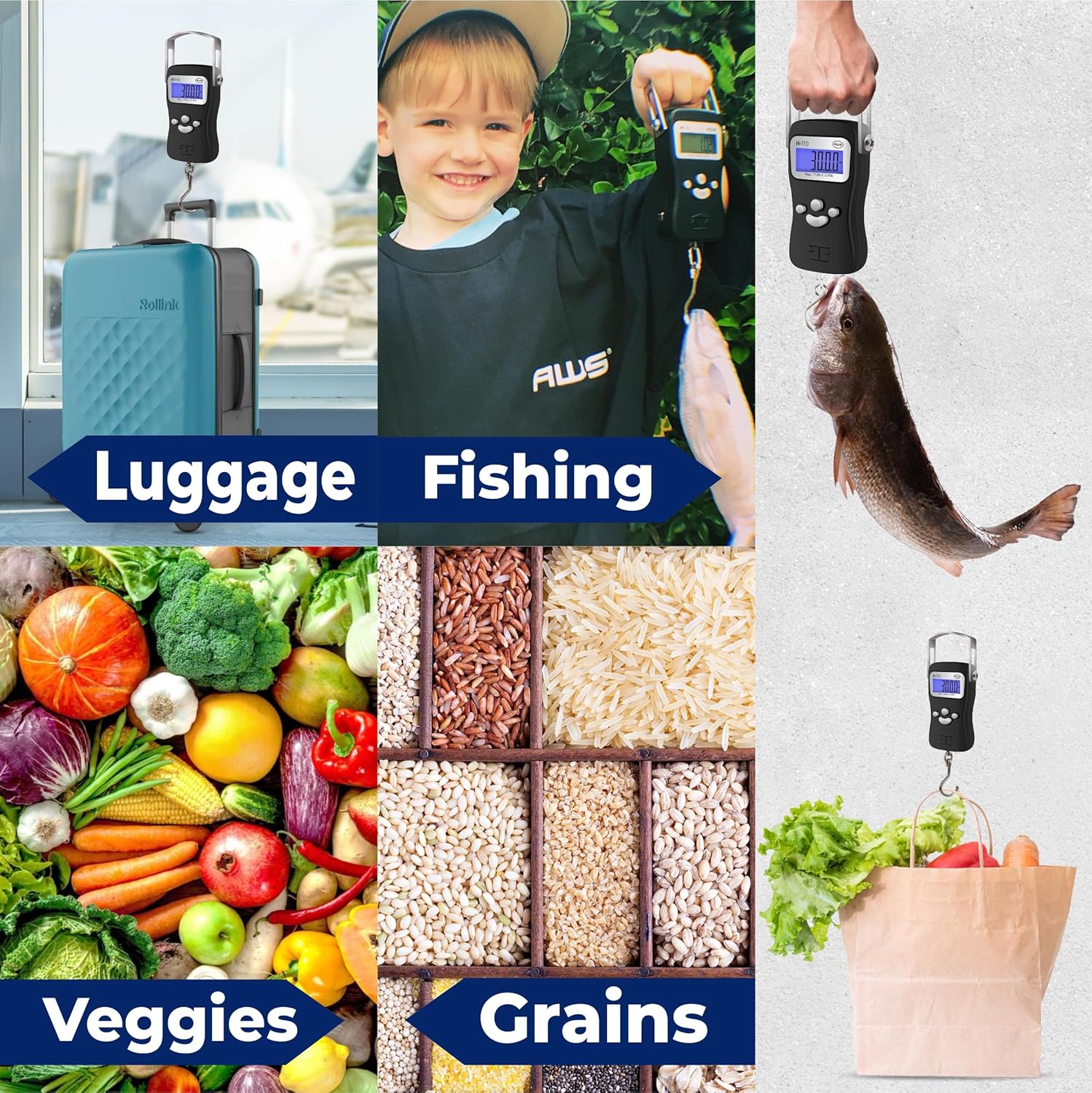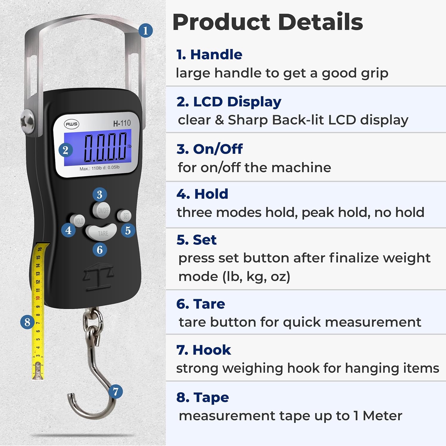 AWS Digital Luggage Scale, Fish Weighing Scale, Hanging Scale 110lb/50kg – Die-Cast Metal Construction, Built-in Tape Measure, Hook & Handle – for Travel, Fishing, Archery, Hunting, Outdoor (Black)