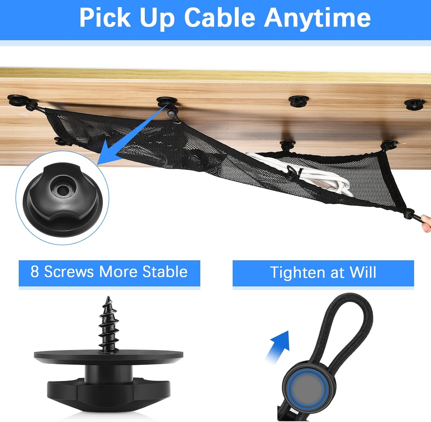 【STURDY AND NEAT CABLE TRAY】Enlarged mesh surface to store all cables, 8 nuts to eliminate the risk of dropping cables. Elastic rubber band, movable buckle and visual mesh structure is flexible to add and remove cables.