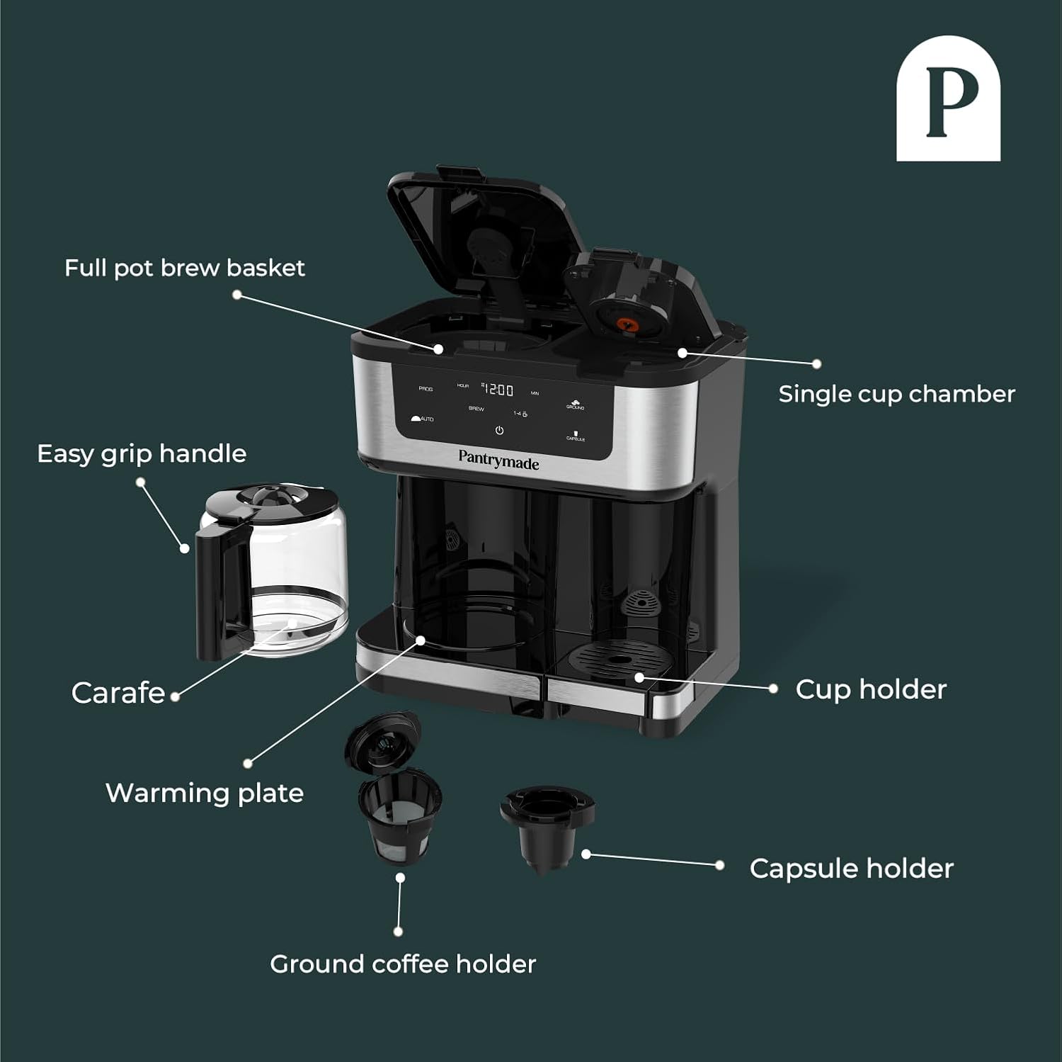 Experience the ultimate in coffee versatility with the Pantrymade 12-Cup Coffee Maker & Single Serve Brewer. Whether you’re brewing for a crowd or just for yourself, this programmable all-in-one coffee machine has you covered. The large 12-cup glass carafe is perfect for family breakfasts or office meetings, while the single-serve option lets you enjoy your favorite Single Cups or ground coffee for a personalized brew. Convenience meets customization with programmable settings that let you schedule your brew in advance, ensuring fresh coffee when you need it most. The adjustable brew size accommodates everything from a quick single cup to a full carafe, while the auto shut-off feature provides added safety and peace of mind. With its sleek design and user-friendly controls, the Pantrymade coffee maker fits seamlessly into any kitchen or office setup. Whether you’re craving a quick pick-me-up or a full pot to share, this versatile machine delivers exceptional coffee every time. Make every cup count with Pantrymade.