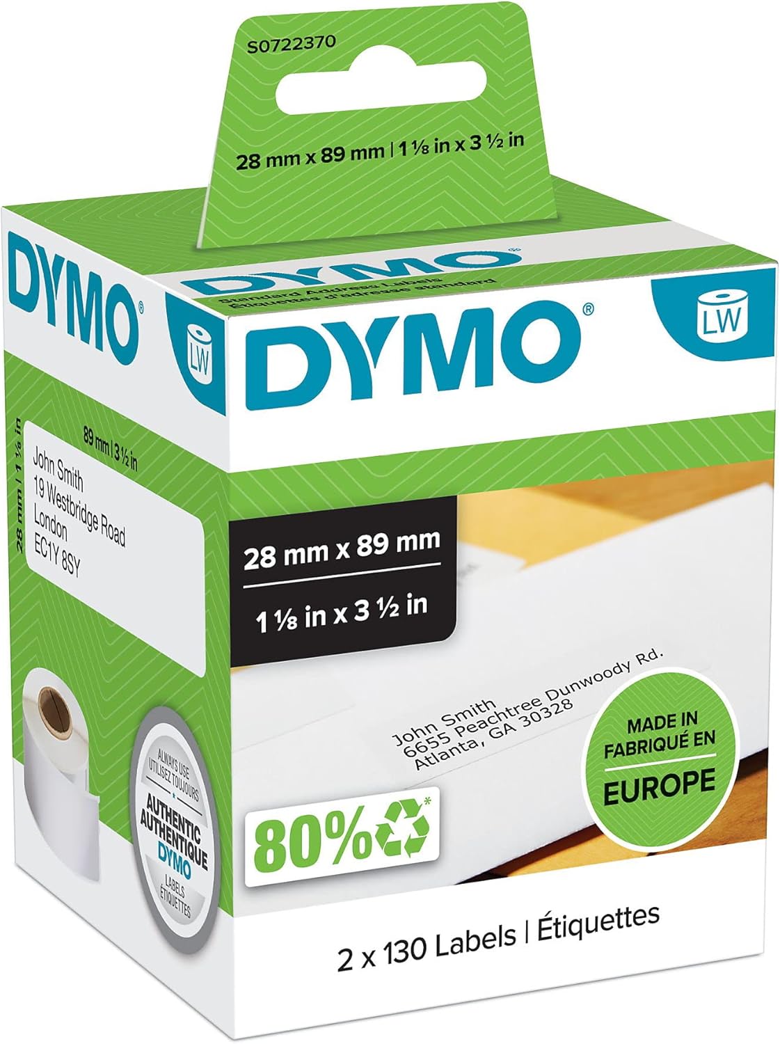 Dymo 28 mm x 89 mm LW Address Labels, 2 Roll of 130 Easy-Peel Labels, Self-Adhesive, for LabelWriter Label Makers, Authentic – Black on White
