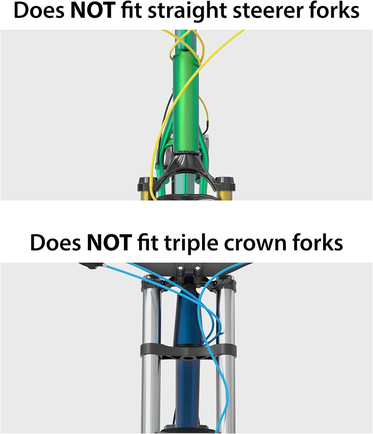 Fits modern mountain bikes with tapered head tubes. NOT compatible with straight head tubes or triple crown forks. Any compatibility issues, contact us first.