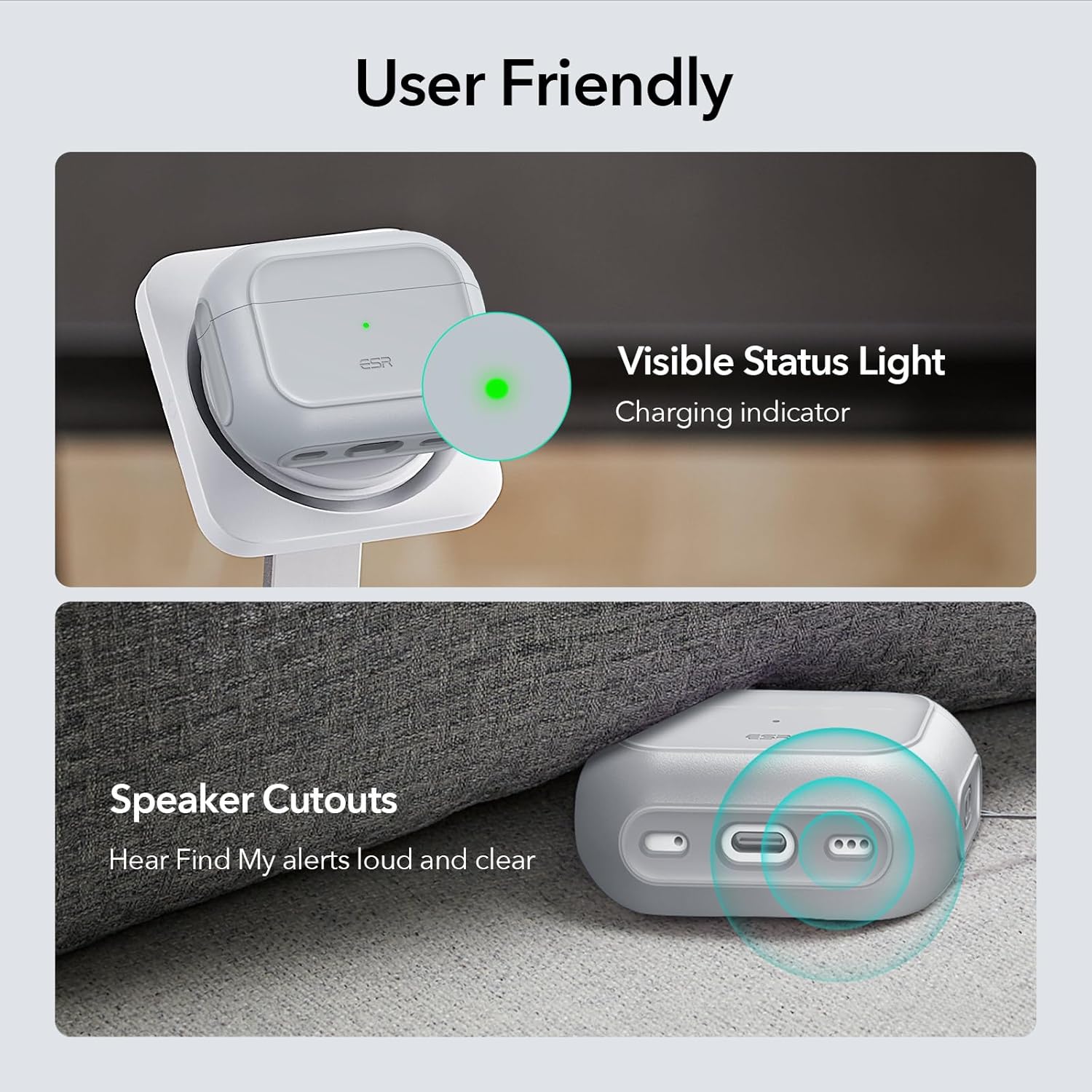 Speaker Cutouts: specially positioned apertures on the base let you hear the FIND MY app sound loud and clear, so you’ll always know where your earbuds are
