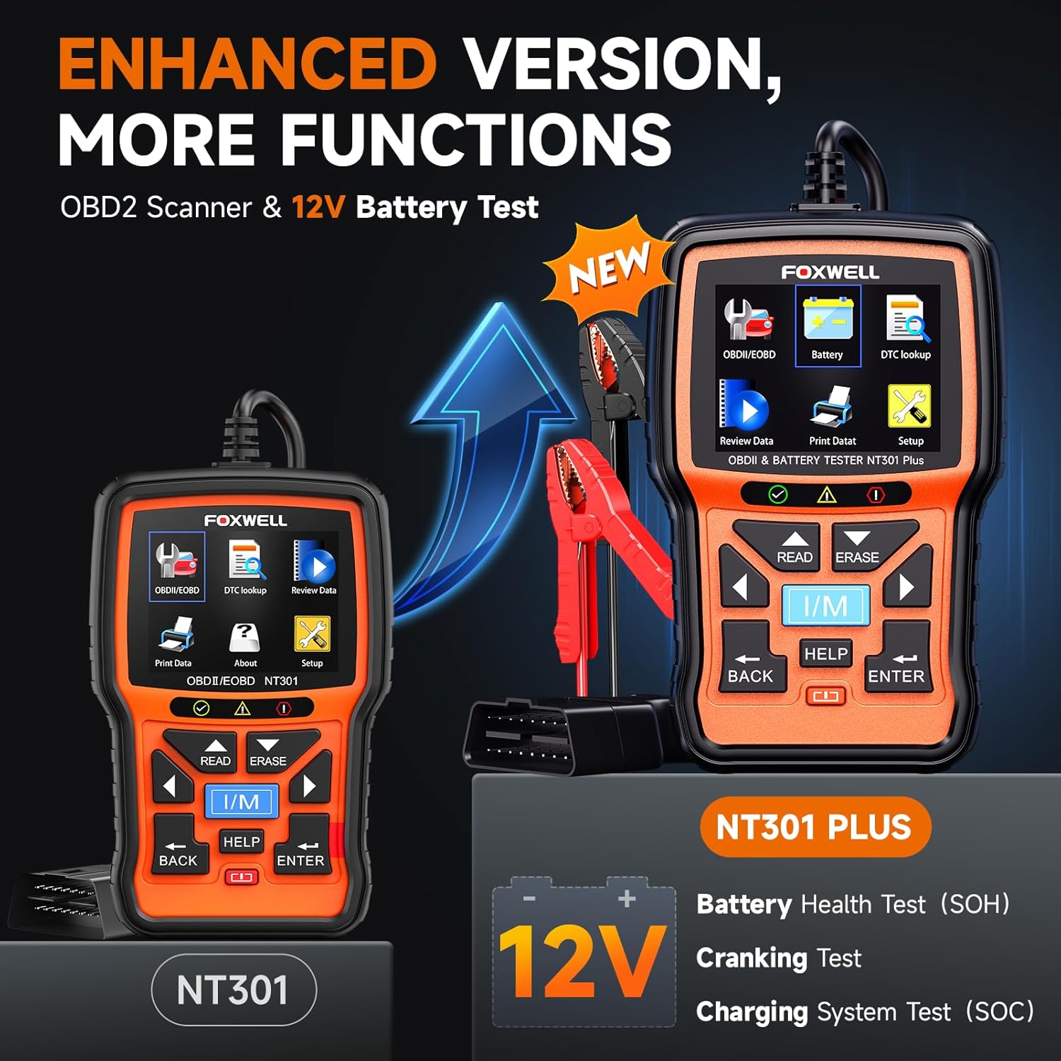 Upgraded of FOXWELL NT301, More Features: 2-IN-1 OBDii scanner with 12V battery tester. Combines full OBD2 functions with battery health testing, one NT301 Plus is enough. With real-time data to help you visualize engine performance and battery health. Quickly identify issues and locate faults. Warm Tip: Please connect the battery clamp cable to the OBD2 diagnostic cable before starting the battery test.