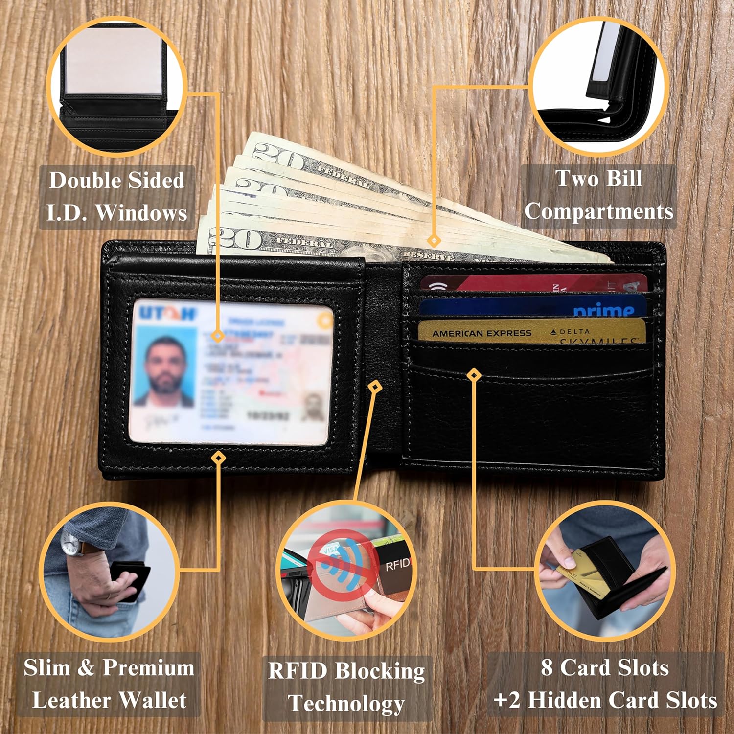 QUICK-ACCESS ID WINDOW & HIDDEN SLOTS: The ID window lets you flash your license or building badge without having to pull it out; And we’ve added two hidden compartments behind the main card sections for stashing emergency cash or those less-used cards