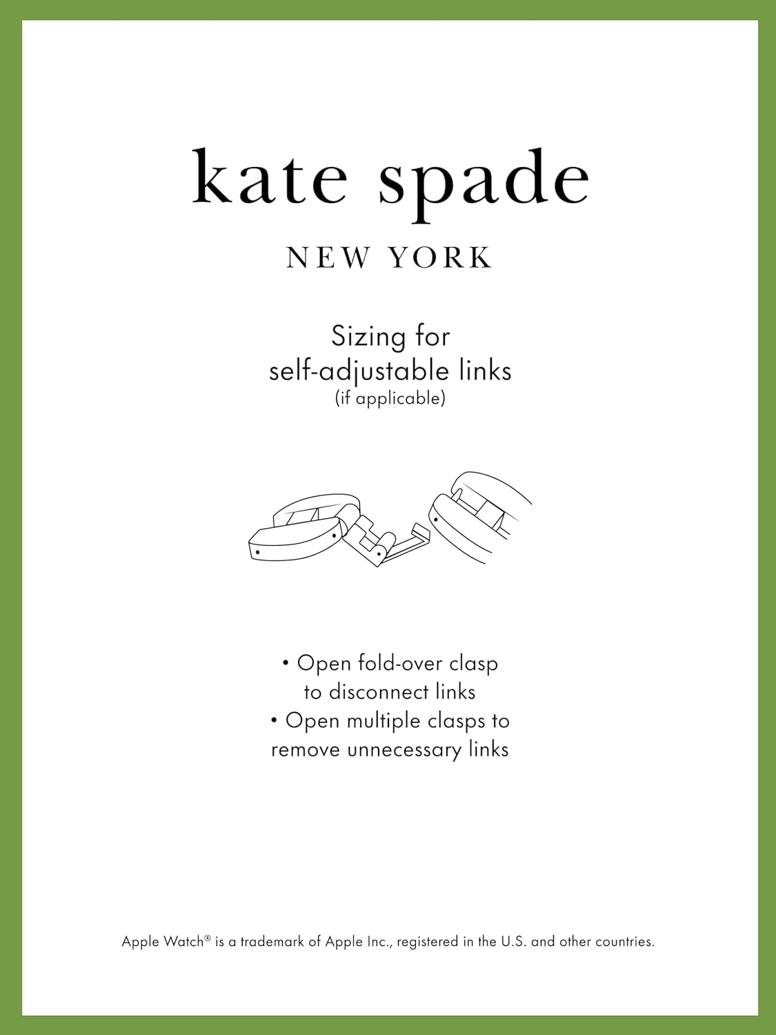 All of our bands for Apple Watch come to you—or the person you’re giving it to— in beautifully designed packaging that’s distinctly Kate Spade New York. The pretty pink box, accented with a sophisticated deep green, is designed to securely hold the band while highlighting its unique features.