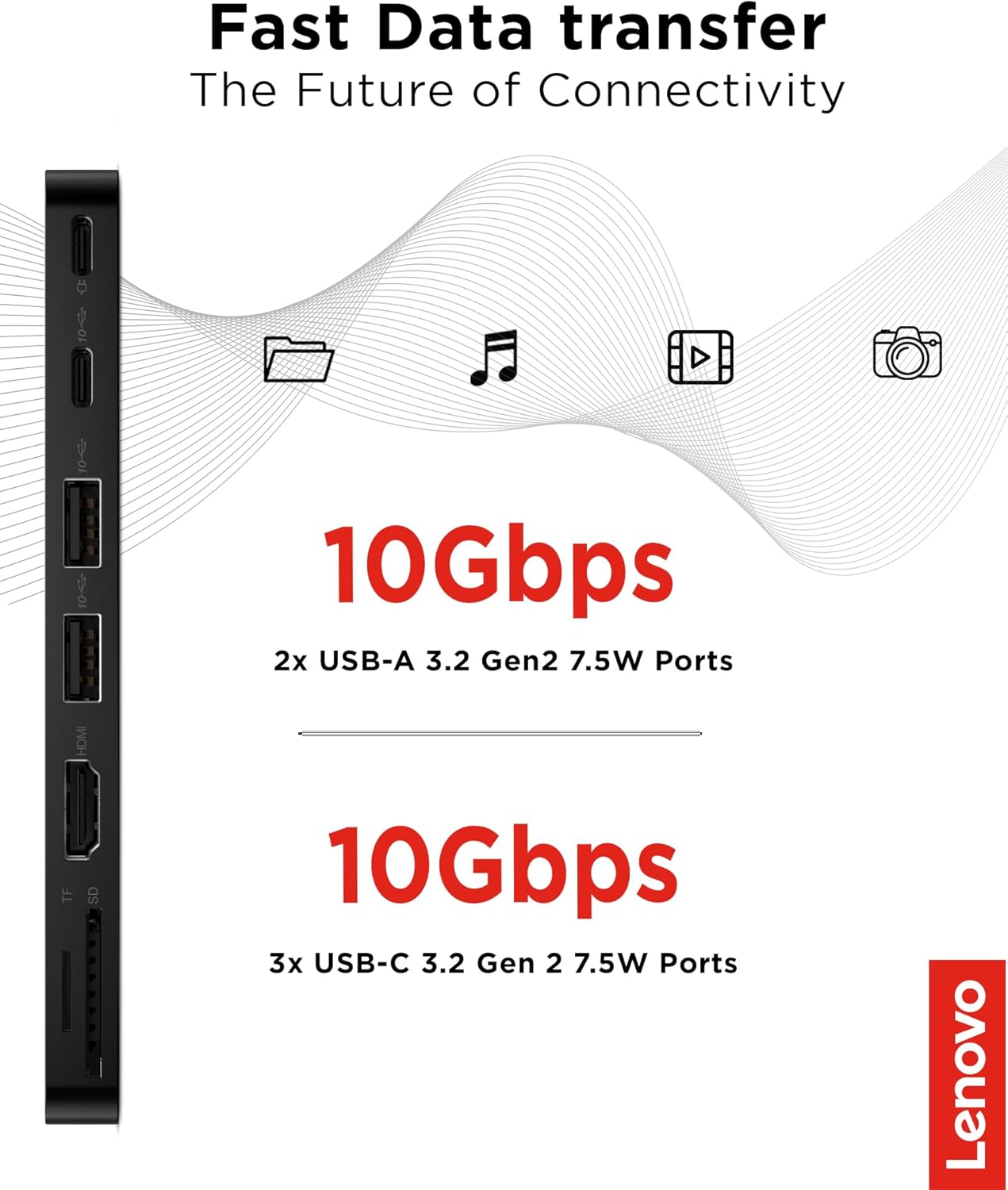 Sustainability & Aesthetics: The Lenovo USB-C Slim Travel Dock embodies a powerful statement in a sleek, compact form. Its Eclipse Black exterior captures its internal power and efficiency. It includes a 66% Post-Consumer Recycled Content (PCC) exterior, combining high performance with environmental consciousness. It leads our portfolio as the greenest dock offering yet from Lenovo