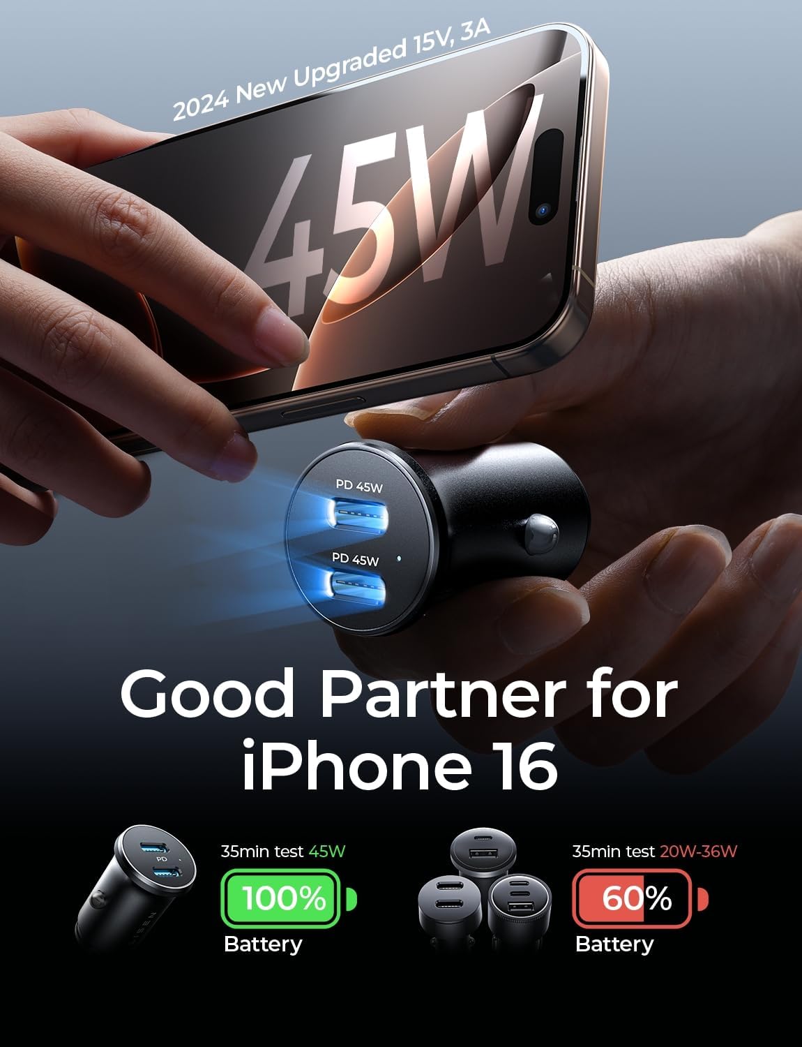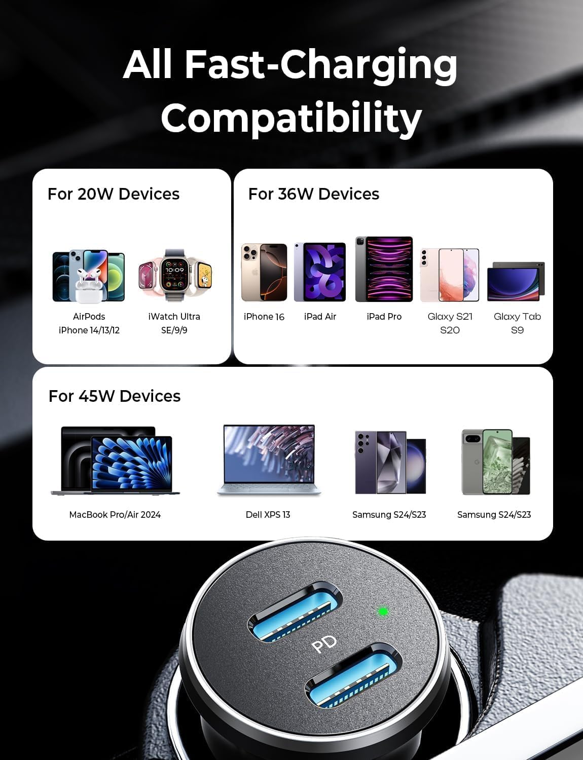 This PD car charger supports the iPhone 16 Pro Max’s 45W fast charging, providing maximum speed. It’s also backward compatible with other Apple devices, ensuring efficient charging for previous iPhone models at their highest speeds