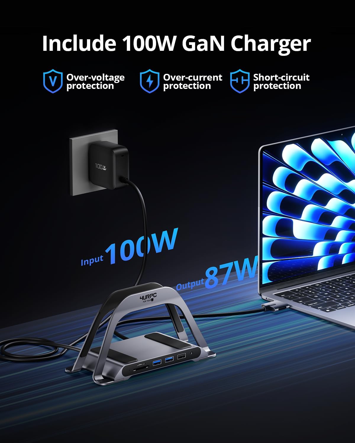 Powerful 100W GaN USB C Charger: This USB C MacBook docking station dual monitor comes with a 100W GaN power adapter, providing incredibly fast charging speeds, eliminating battery anxiety! It can power your laptop even during intense work