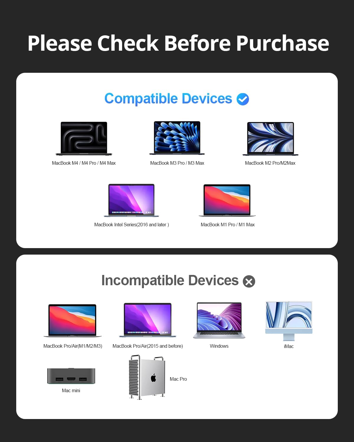MacBook Pro/Air Note: MacBook docking station dual monitor supports 13” 2018-2020 MacBook Air (Intel chip), 13″/15″ 2016-2020 MacBook Pro (Intel chip), 14″/16″ 2021 MacBook Pro (M1 Pro chip), 14″/16″ 2023 MacBook Pro (M2 Pro chip), 14″/16″ 2023 MacBook Pro (M3 Pro or M3 Max chip), 13”/15” 2024 MacBook Air (M4 chip), 14″/16″ 2024 MacBook Pro ( M4 Pro or M4 Max ) to expand dual monitors. Note: M1/M2/M3 chip only can get 1 external monitor