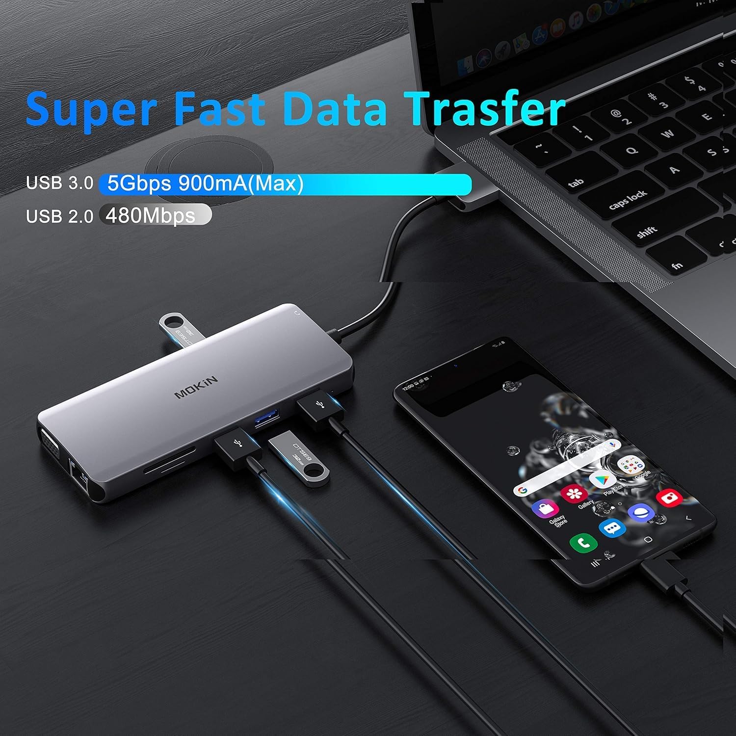 Fast Data Transfer Speed(2xUSB3.0+2xUSB2.0+1000MB Ethernet port) With 2x USB 3.0 ports with 900mA output and ensure instant sync and file transfer at 5Gbps and 480Mbps transfer speed accordingly, and easily connect smartphones, tablet, hard drives for effortless data transfer with USB-C port. 2 extra USB 2.0 ports allows you to connect keyboard or mouse without any lag. A 1000 Mbps Ethernet port provides a more stable and faster connection to a wired network.