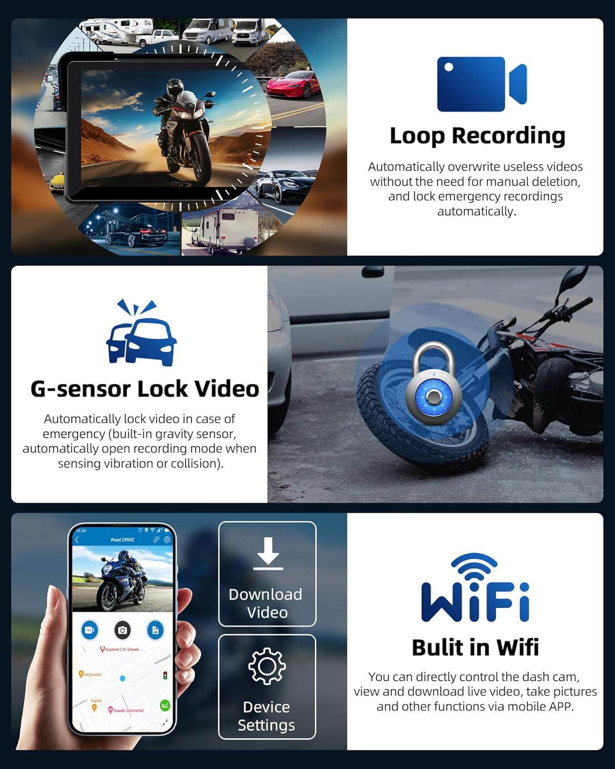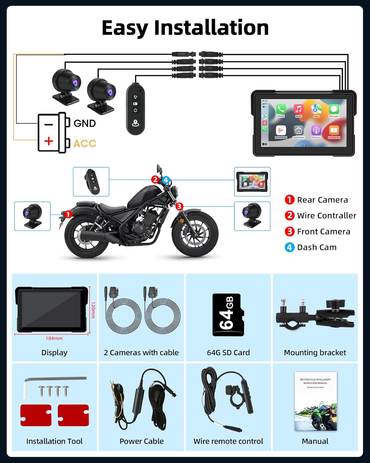 Apple CarPlay and Android Auto Wireless for Motorcycles7-inch IPS 2.5D touchscreenSimultaneous 2K recording with two lensesSupports Bluetooth connectivity for headphones, stereoSupports Bluetooth phone callsiPhone/Android mirror linkReal-time map navigation