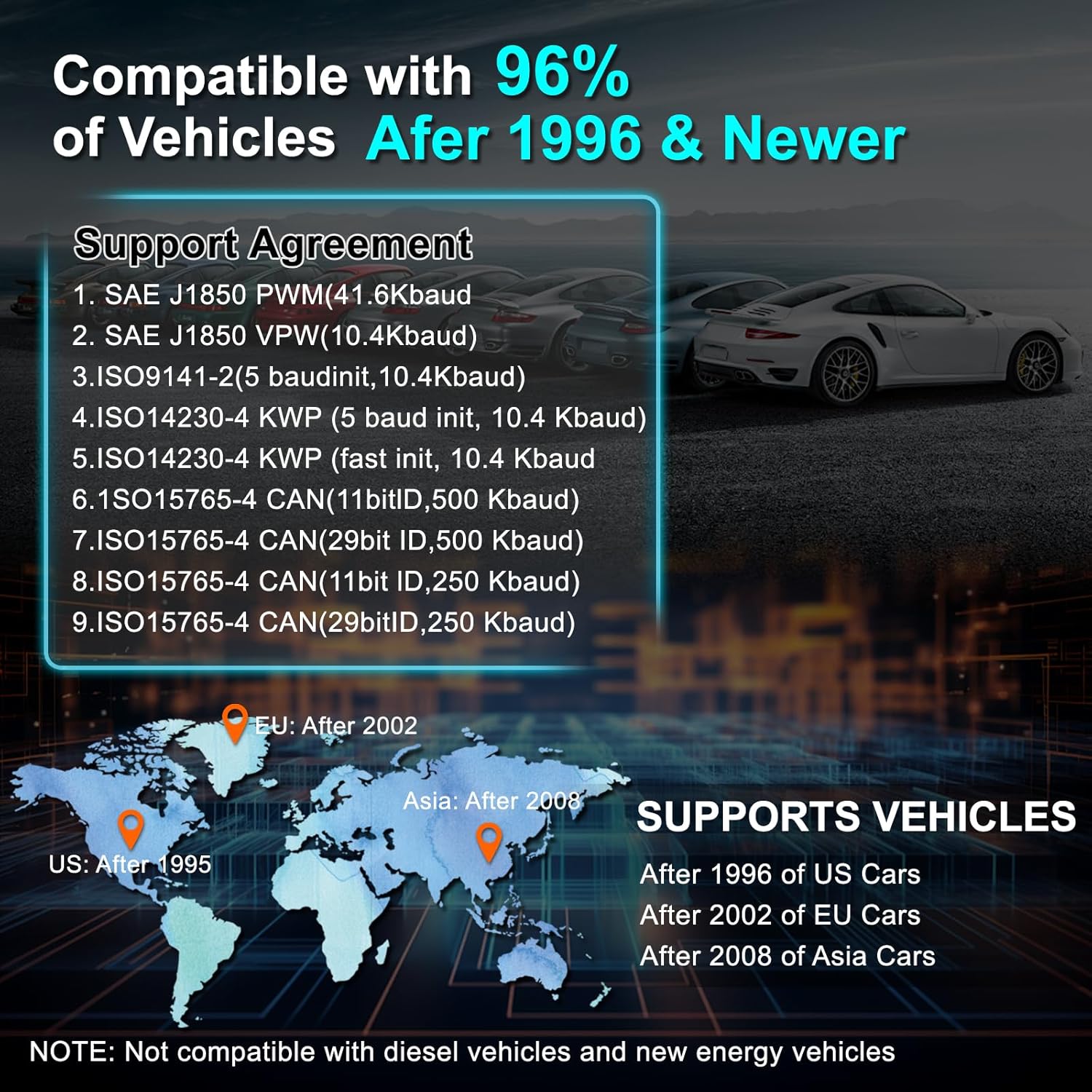 Automotive Compatibility – The V011 OBD2 Scanner supports over 96% of car makes and models. Support year differing from 1996 to now and 9 OBD2 protocols. It works in English, German, Spanish, Finnish, French, Italian, Dutch, Portuguese, and Chinese.