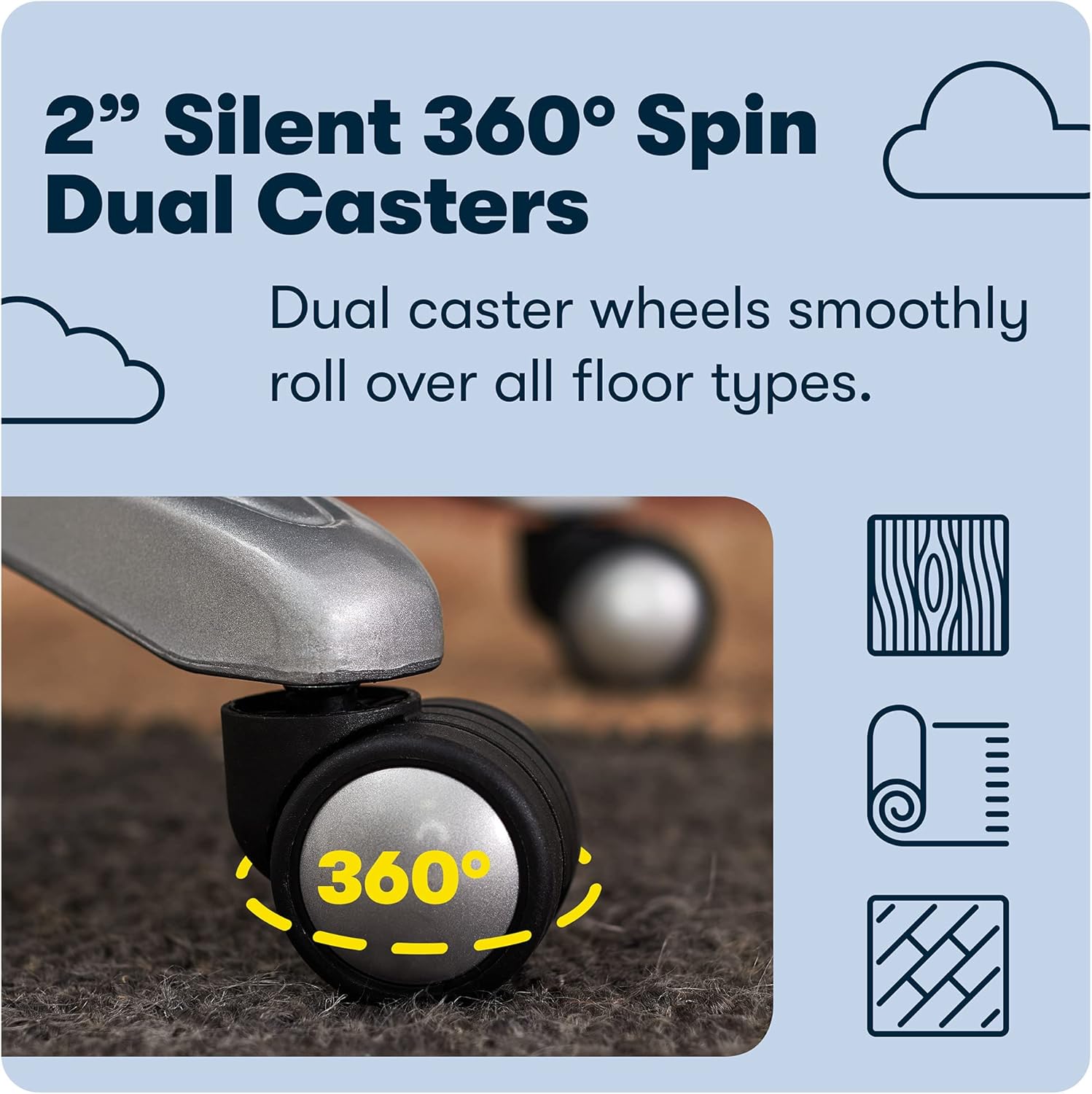 SMOOTH ROLLING: Multi-surface, dual-wheel designer casters make it easy to move around