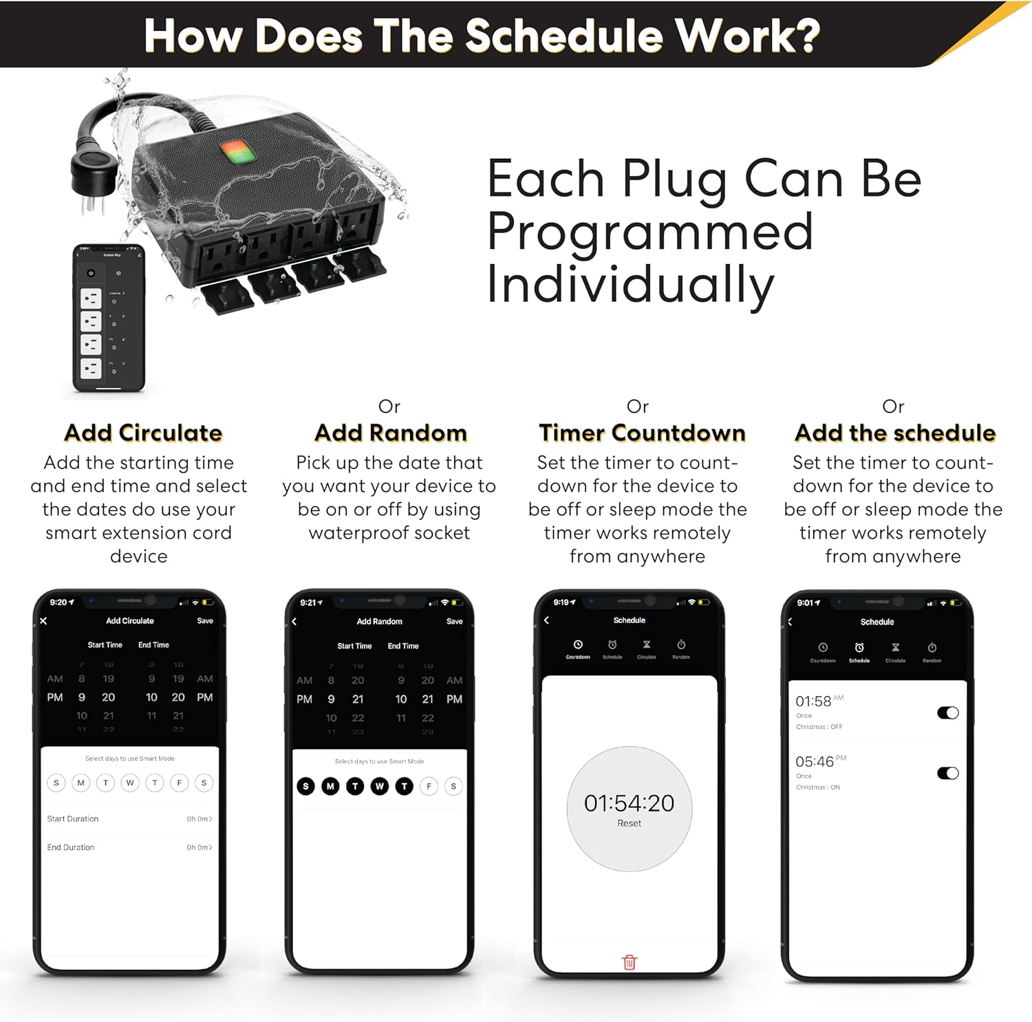 ELECTRIC POWER ON/OFF EXTENSION CORD – SCHEDULE and TIMER: set automatic daily timers or create on/off so that your devices can turn on and off on their smart socket