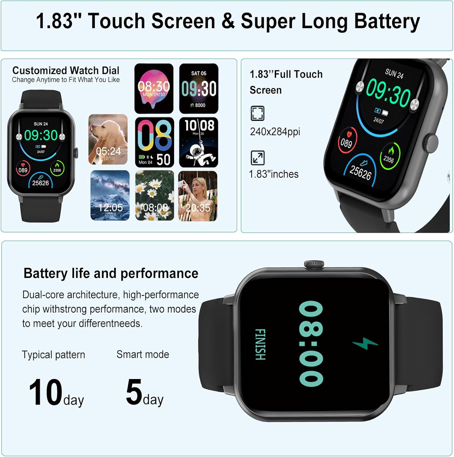 ⌚【1.83″ Touch Screen & Super Long Battery】- 1.83″ touch screen color smart watch women with 240*284 resolution ratio, brings you a unique visual and better interactive experience. Fully charged in 2.5-3 hours, the battery can be used for 5-10 days, Normal use for 7 days and standby for 30 days.
