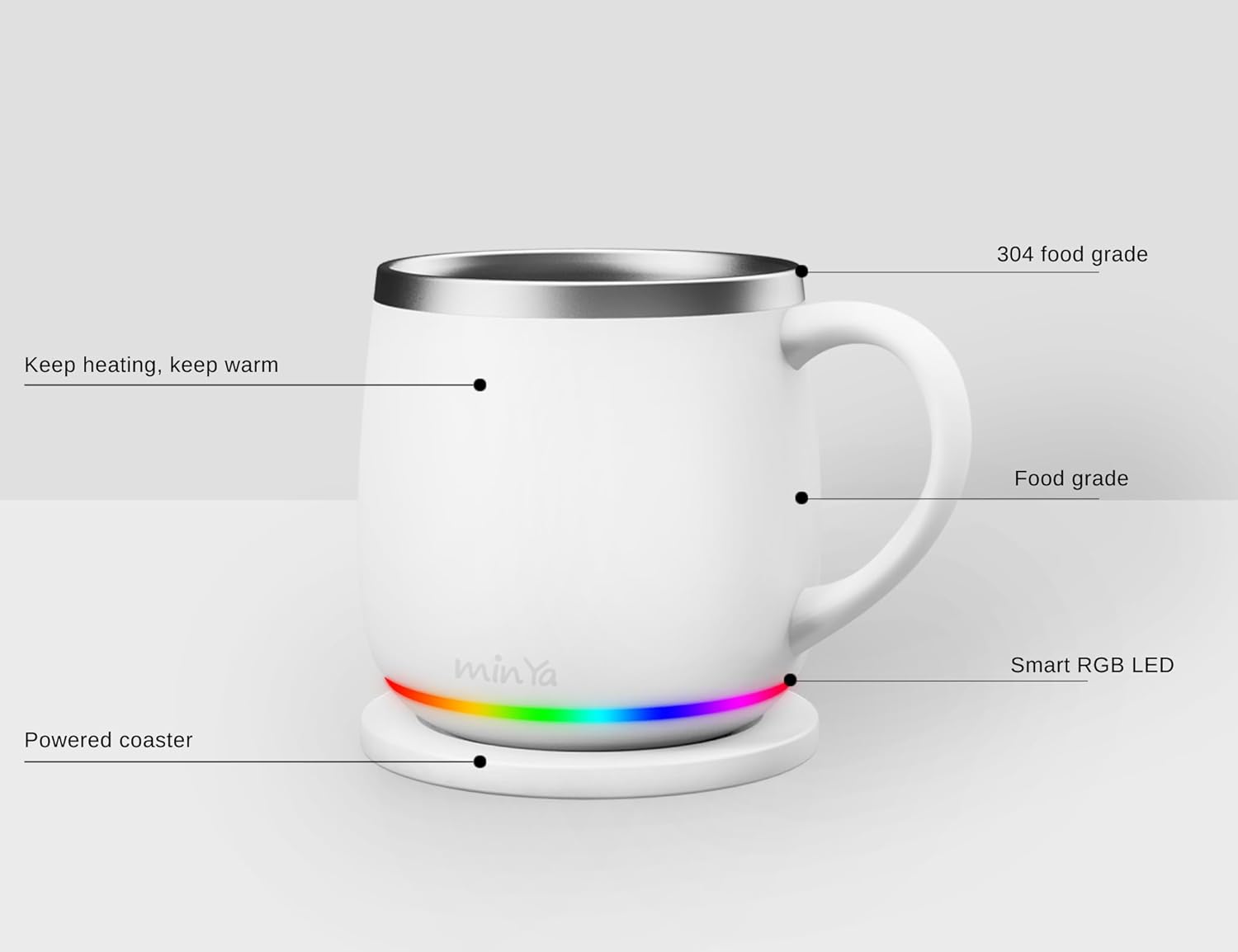 min Ya heating temperature control smart mug needs to be placed on our dedicated heating coaster (do not use any other third-party accessories) and plugged into a power supply to activate the heating function.