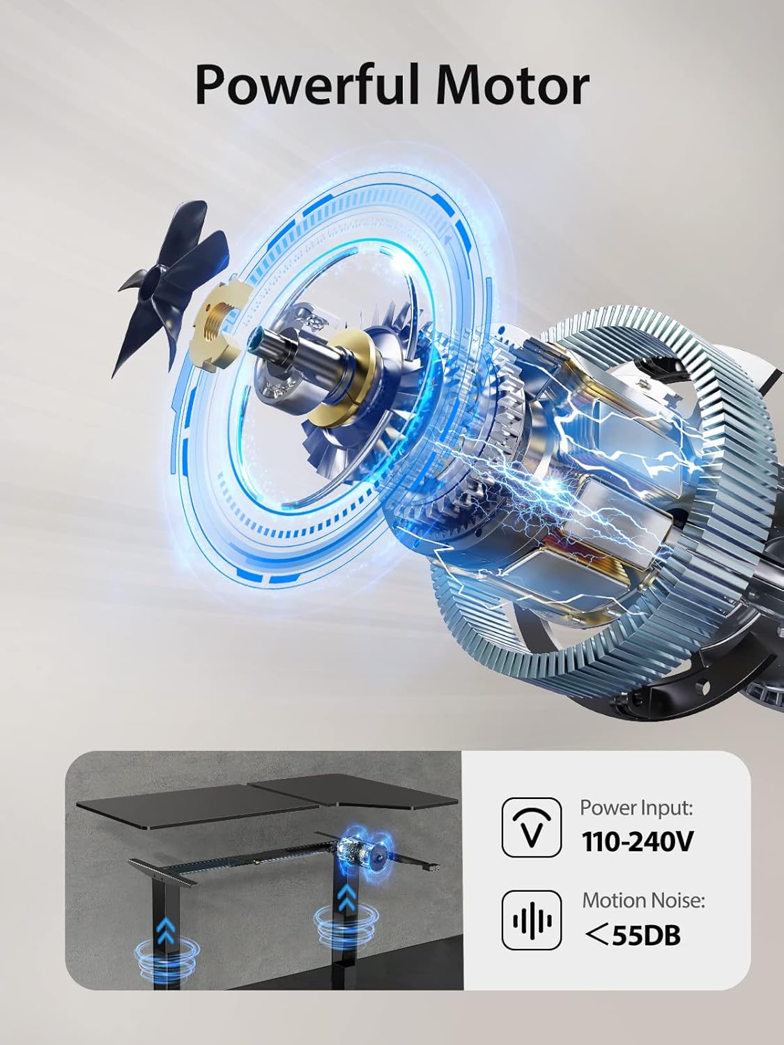 Sturdy and Quiet: Our electric standing desk includes robust T-Style legs for stability and a thick tabletop panel that is easy to clean and scratch-resistant. This height adjustable desk is equipped with a powerful yet silent motor, adjusting smoothly at the speed of 2″/second with minimal sound (under 50 dB)
