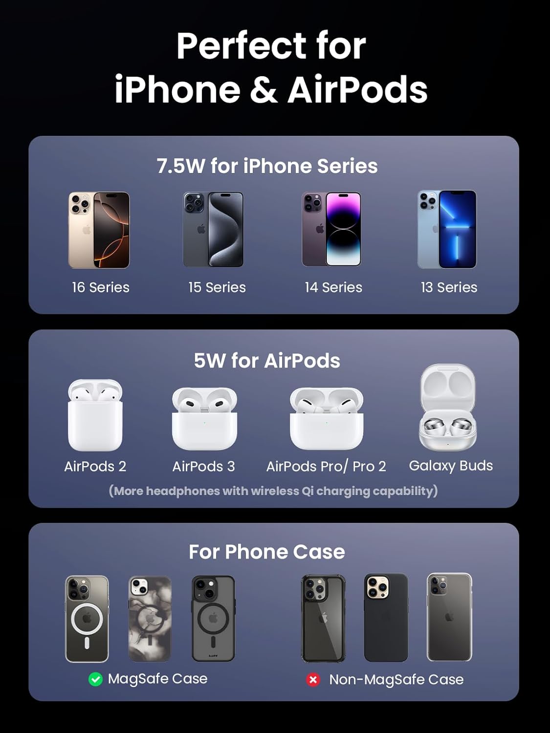 Broad Compatibility: The UGREEN MagFlow magsafe stand is designed for various devices, compatible with iPhone 16/16 Pro/16 Pro Max/15/14/13/12 series, AirPods Pro 2/1, AirPods 4/3/2, Galaxy Buds, and most Qi-enabled devices. Note: For optimal charging, use with a magnetic phone case or without a case
