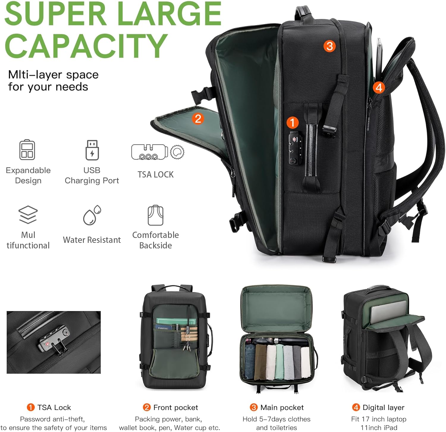 VGOAL Carry on Backpack, 40L Expandable Travel Weekender Overnight Luggage Bag Extra Large Backpack Fit up to 17.3″ Laptop