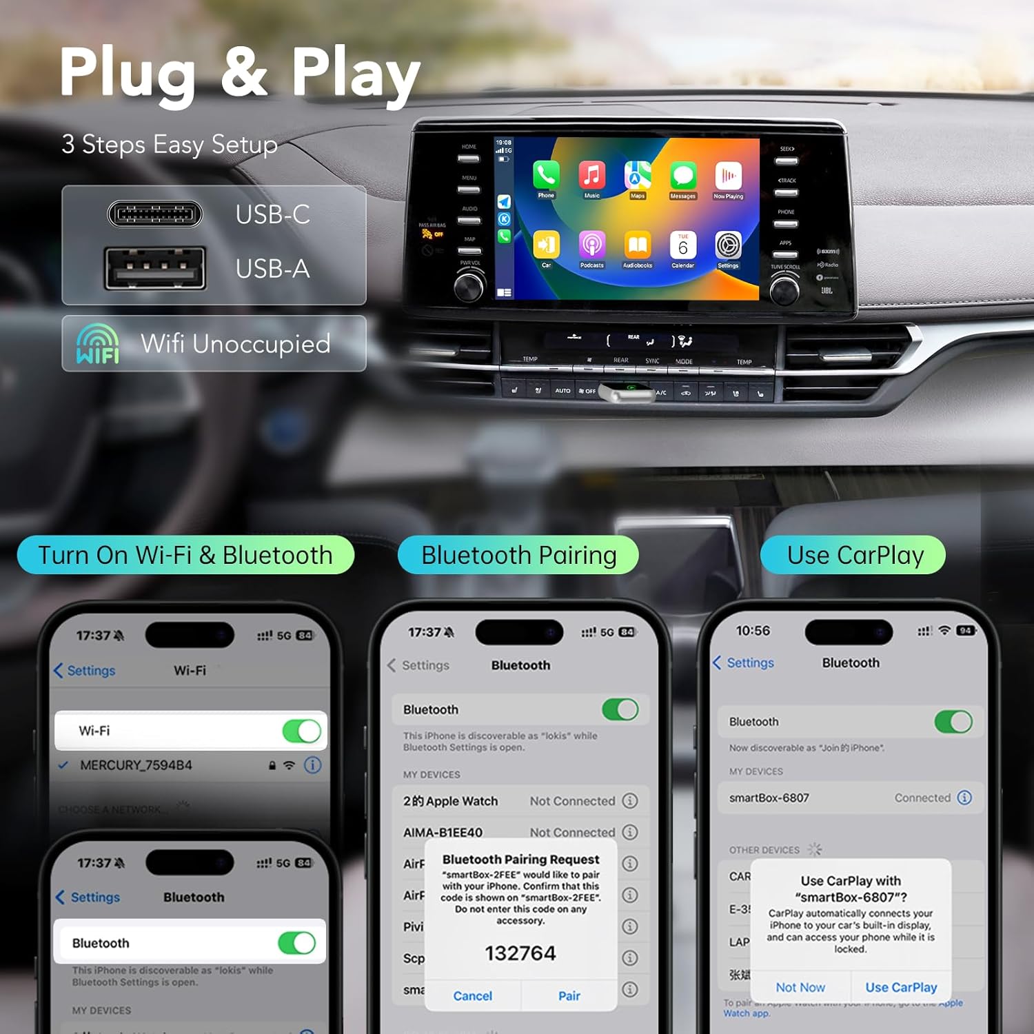 It’s fully plug and play. Simply connect the dongle to your car’s USB port, pair it with your iPhone via Bluetooth.